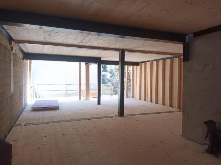 - Structure porteuse en poteaux bois lamellé-collé et poutres métalliques noyées dans l’épaisseur des planchers