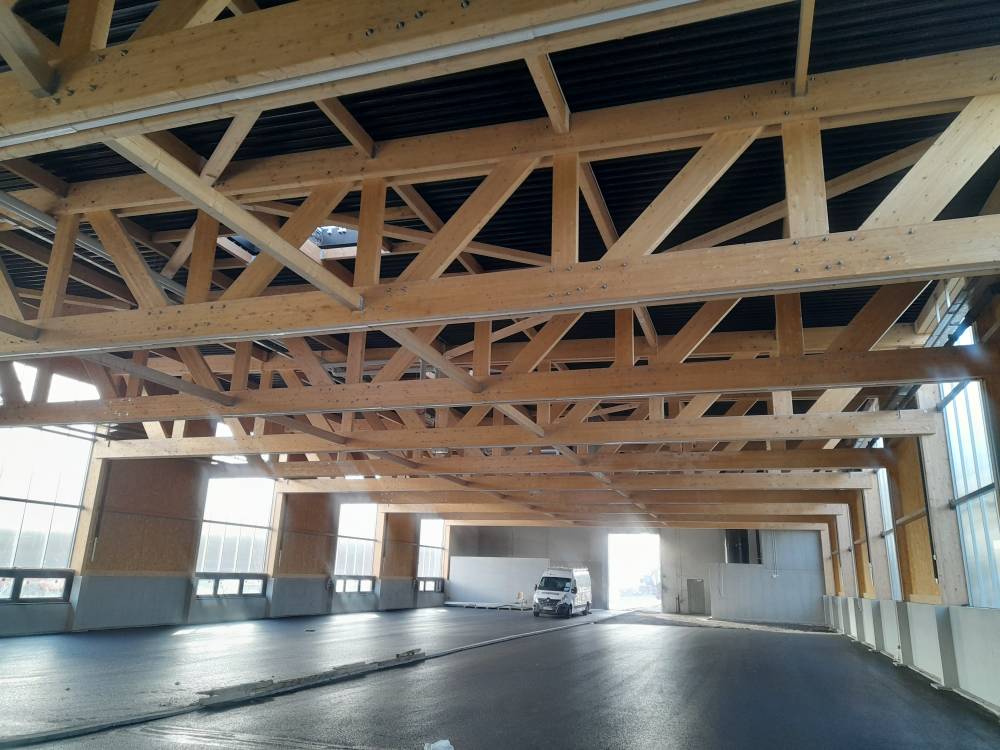 - Poutres treillis en bois lamellé-collé, d’une portée d’environ 23,2 m