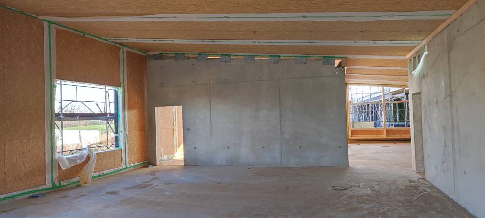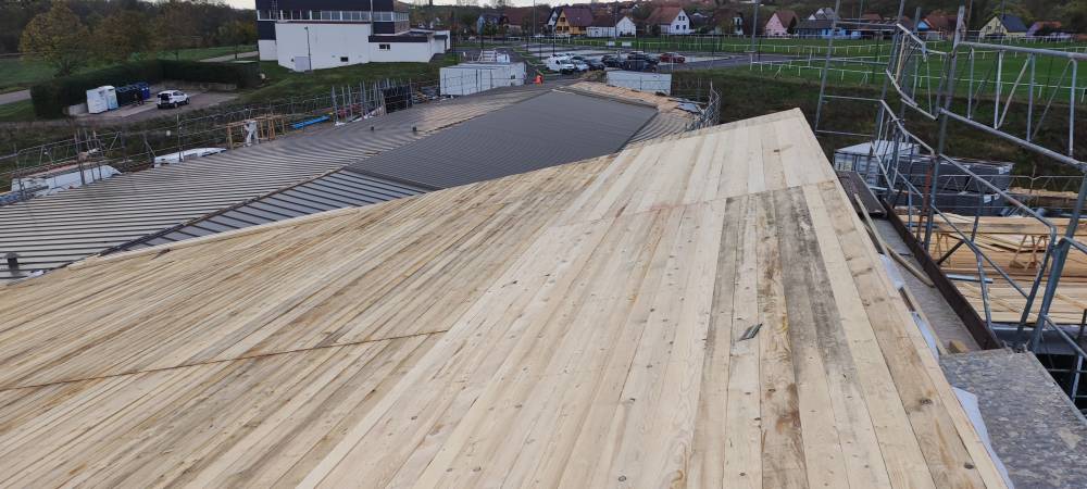 - Caissons de toiture préfabriqués en usine, avec chevrons BLC et isolation d’épaisseur 40 cm