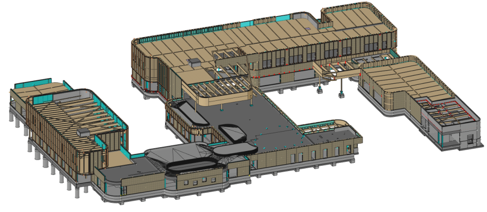 - Stabilité verticale par murs à ossature bois, voiles CLT et noyaux en béton armé