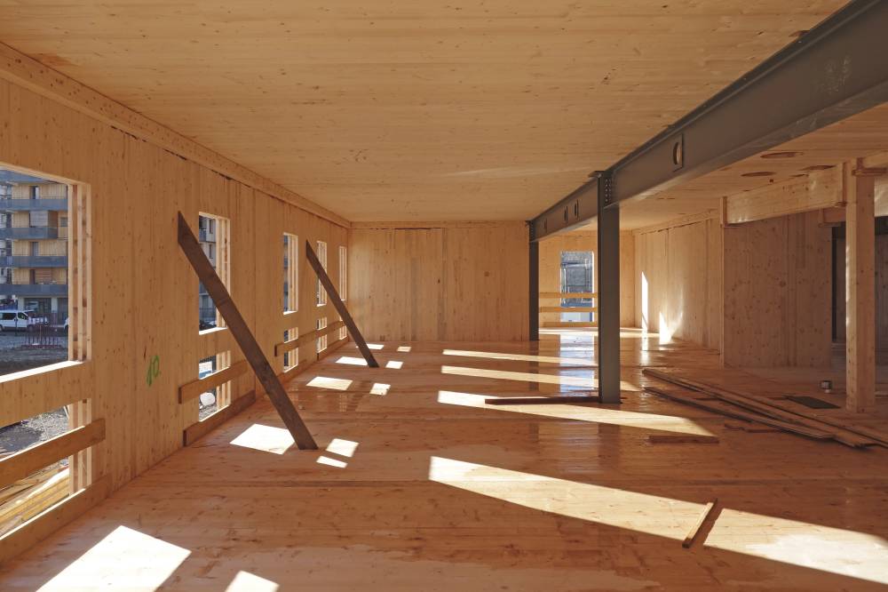 - Planchers, toiture, façades et refends en panneaux de bois massif contrecollés